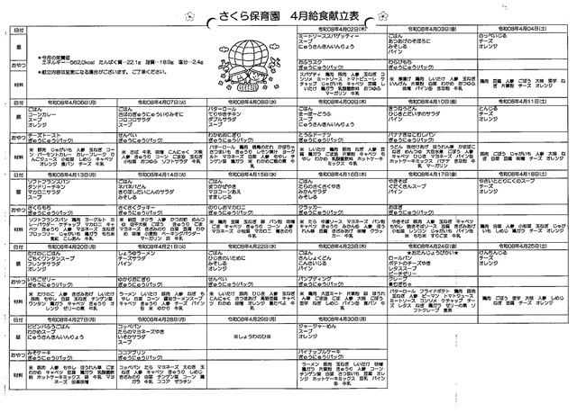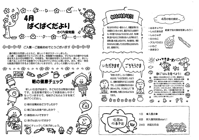 食事は、基本的な習慣を身につけ必要な栄養やエネルギーを満たす養護としての役割にとどまりません。授乳、離乳食、昼食、間食、水分補給は、豊かな食文化や知恵の伝承でもあります。 また子どもクッキングなど「食をつくる活動」を通じて、社会事象への関心を広げるきっかけとしています。できるだけ食材の産地を子どもたちに伝えるなど、子どもたちたちが必要な食文化の体験ができるようにします。 子どもにとっての食事は、心身の発育だけではなく、情緒面の発達にも影響を与えます。乳幼児期は、日々の活動も活発で、大人に比べて体の割には多くの栄養を必要とします。また最近は、一人で食べることを好む「孤食」や「個食」の傾向が強まっているといわれています。そのため、当保育園では、「食」を保育の一環としてとらえ、栄養のバランスを図るだけではなく、将来にわたって豊かな食生活・食文化を作り出していけるような基礎を培えるような工夫をしています。